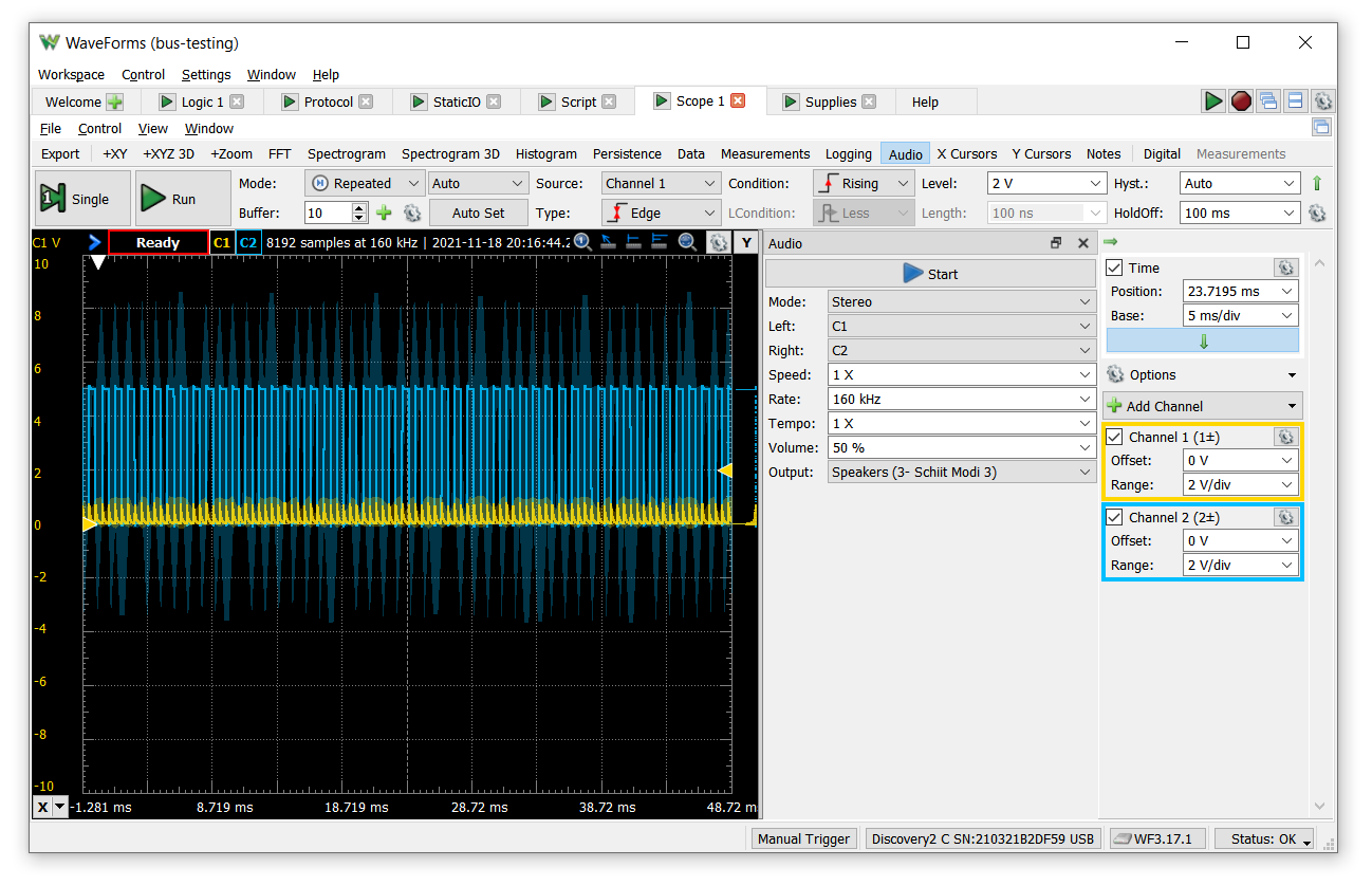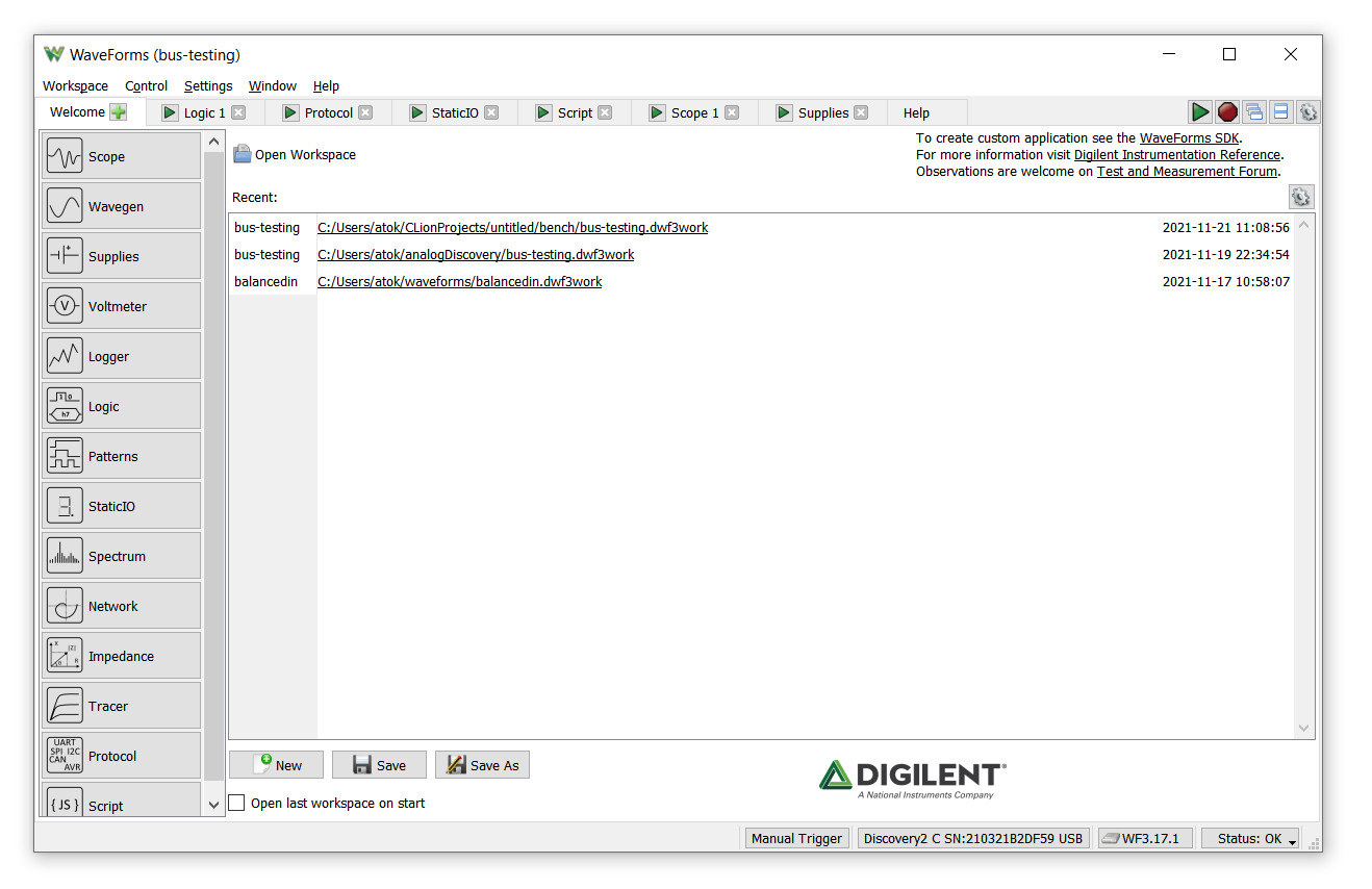 This device was released in 2016 it’s still an interesting candidate for a all-in-one lab instrument. Currently priced at 399 USD (279 USD for US students) its not cheap. But, in a small package we get “USB oscilloscope, logic analyser, and multi-function instrument that allows users to measure, visualize, generate, record, and control mixed-signal circuits of all kinds”. It’s targeted mostly at students and hobbyists. And it shows, in a good way. It is accompanied by the WaveForms app that will be the focus of this text.