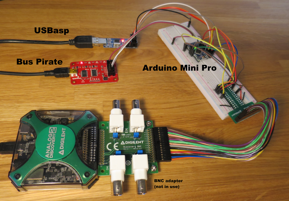 Arduino Pro Mini does not have an onboard USB connector for debugging and I prefer to program it using ISP so, the microcontroller is also connected to the PC using a serial-to-USB converter (Bus Pirate) and a USBASP ISP programmer.
