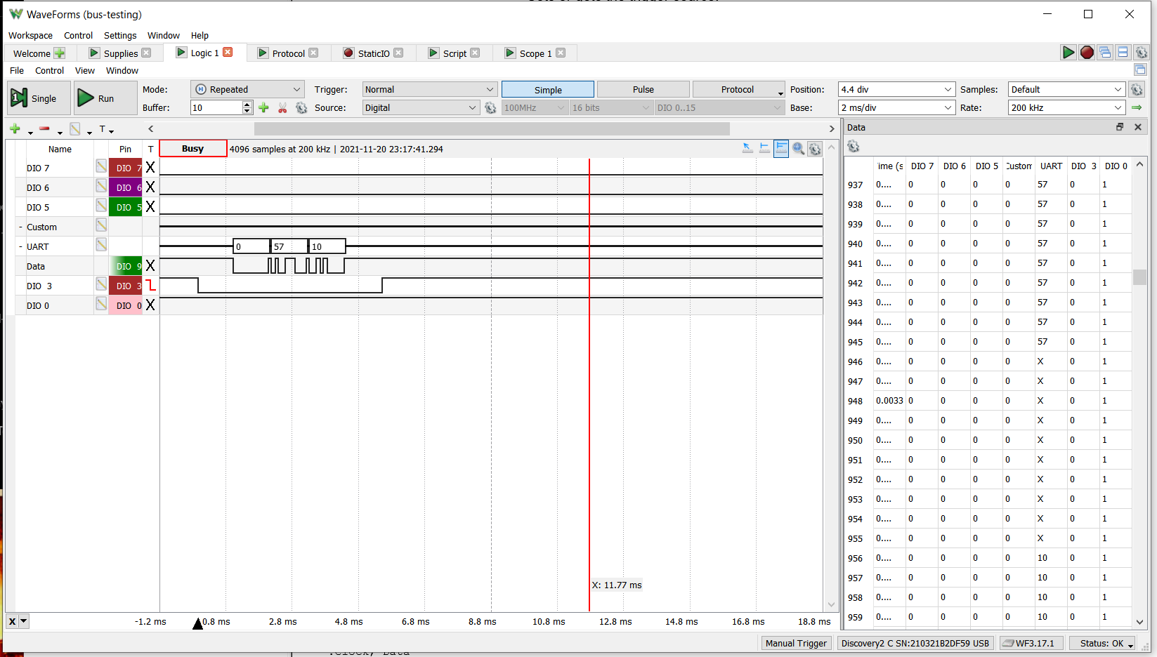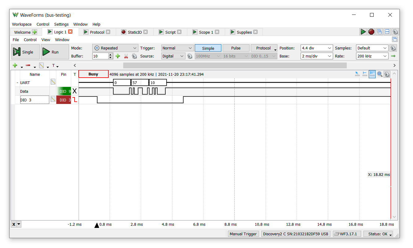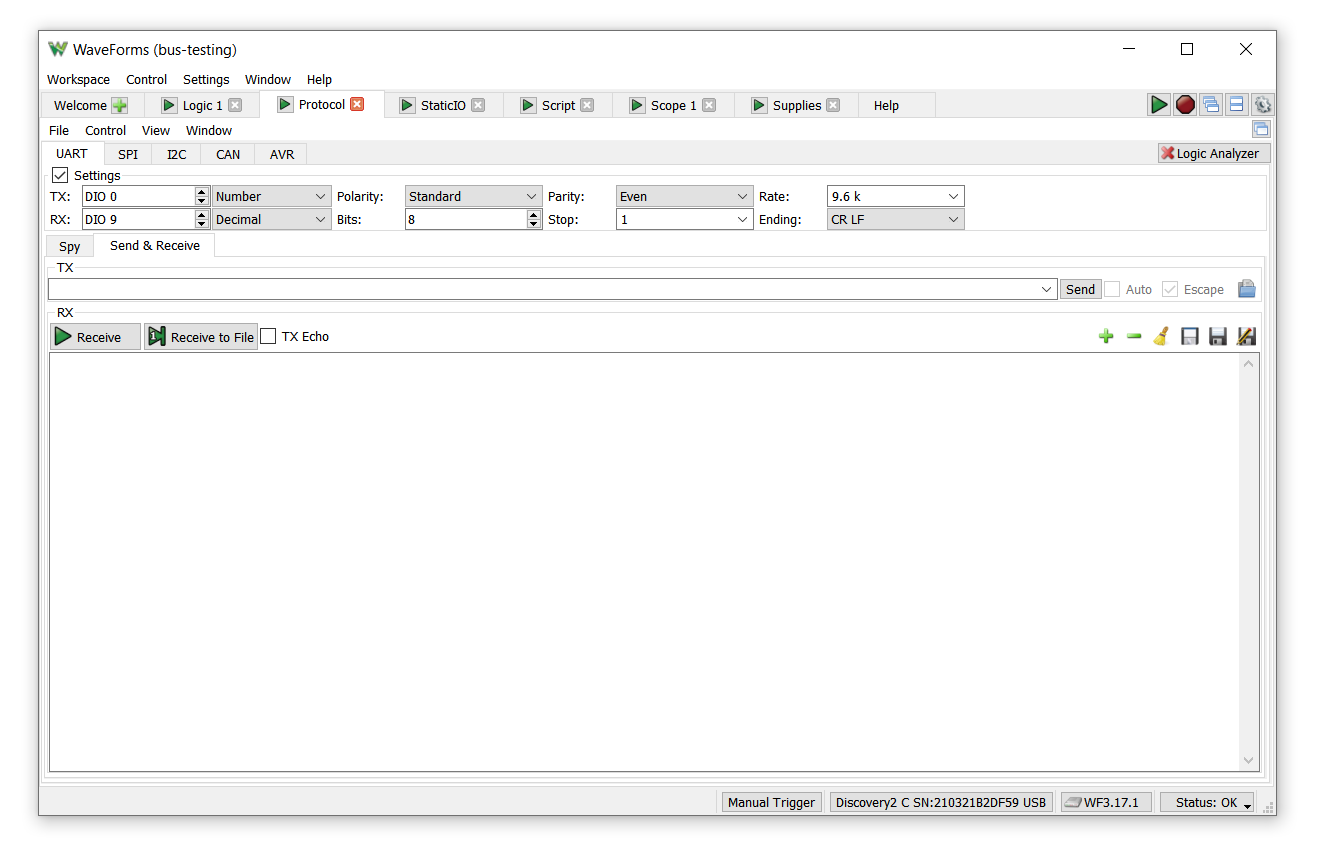 Supplies: set to 5V and enabled Logic: UART TX and an additional pin added, triggering configured and tested to work correctly. Protocol: UART tab open, tested to receive and send the data.